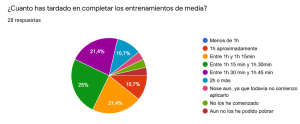 Si te fijas ante un entrenamiento EXACTAMENTE IGUAL para 25 sujetos diferentes (excluyendo a los 3 que no lo han comenzado) tenemos +10% que tarda +2h mientras que un +21% tarda entre 1h y 1h15´ apróx.