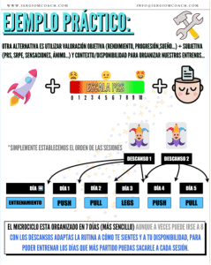 Por lo que siguiendo este planteamiento, que es lo que hago yo y recomiendo a mis entrenados, NO tendrás que ir a entrenar días fijos si no que tendrás que repartir los descansos que te toquen según tu rutina a modo de comodín según tu contexto y cómo te encuentras, es decir autorregulando. Aunque es cierto que si por ejemplo SÓLO puedes ir a entrenar ciertos días (por ej. por trabajo o tu gimnasio cierra) poco margen de maniobra tendrás.