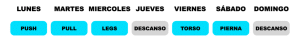 Sin embargo, como he comentado, la mayoría de personas por comodidad suele estructurar sus entrenamientos dentro de la duración de 1 semana. De hecho, la mayoría de «rutinas» que puedes encontrar por internet van a enmarcarse dentro de una semana, y rellenar el resto de días con «Descansos» hasta completarla.