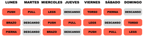 Aquí te adjunto un ejemplo de rutina híbrida Push-Pull-Legs + Torso pierna de 5 días con 2 descansos, que seguramente ya es más complejo de lo que vas a encontrar por ahí donde suele verse torso/pierna, push/pull, fullbodys o similar