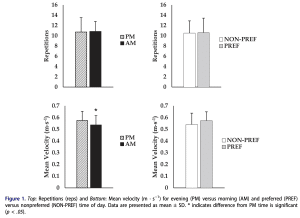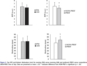 En la imagen podemos ver la comparativa en el nº de repeticiones, sRPE y motivación y velocidad media de las reperticiones. Sólo hubo diferencias significativas en la velocidad media. Sin embargo parece ser que entrenar «a tu hora preferida» (sea cual sea) mejora la motivación y reduce el sRPE por tanto «te cuesta menos» entrenar.